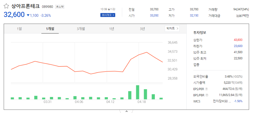 상아프론테크 현재 주가는 33,700원이며 전일 대비 -1,200원의 모습을 보이고 있습니다. 상아프론테크의 주주현황을 살펴보면 이상원(외 20인)이 지분 42.40%를 소유하고 있습니다. 상아프론테크는 전자 장비 및 기기 기업으로 장중 기준으로 주가는 33,700원 입니다. 삼성전자의 시가 총액은 5236억 원이며 발행 주식수는 3.48주 입니다. 외국인 보유 비중은 273,652% 이며 장중 거래량은 15,989,037를 기록했습니다. 매출액은 1,812억 원, 영업이익은 120억 원을 달성했습니다. EPS는 원이며 상아프론테크 주식 배당수익률은 4,177,569% 입니다.