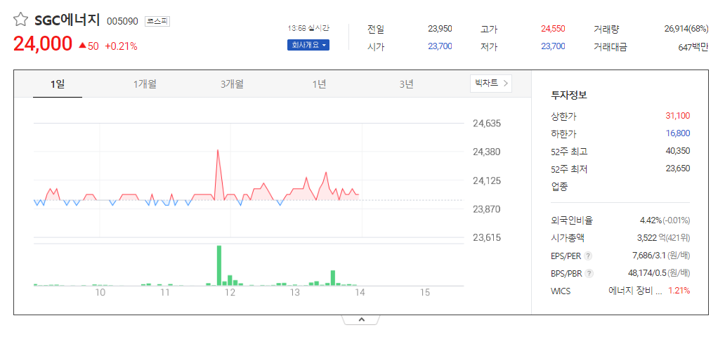 이 글에서는 SGC에너지 주가 전망과 목표 주가, 기업 정보에 대해서 설명합니다. 주식을 보기 전에 기업의 현재 주가와 재무 상태에 관해서 살펴보는 것은 매우 중요합니다. SGC에너지 주식의 주요 현황과 투자 정보를 확인하시고 현재 시장 흐름을 알아보겠습니다.