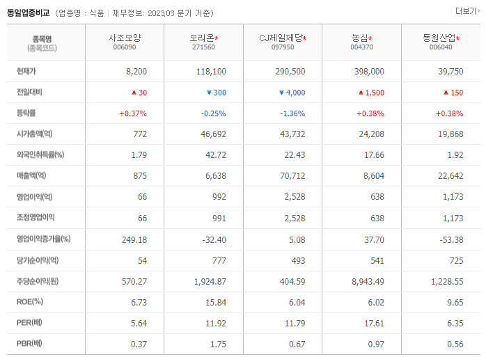 사조오양 현재 주가는 8,170원이며 전일 대비 -2.39원의 모습을 보이고 있습니다. 사조오양의 주주현황을 살펴보면 사조대림(외 2인)이 지분 64.79%를 소유하고 있습니다. 사조오양는 식료품 기업으로 장중 기준으로 주가는 8,170원 입니다. 사조오양의 시가 총액은 773억 원이며 발행 주식수는 1.79주 입니다. 외국인 보유 비중은 4,565% 이며 장중 거래량은 9,422,739를 기록했습니다. 매출액은 875억 원, 영업이익은 102억 원을 달성했습니다. EPS는 없음원이며 사조오양 주식 배당수익률은 4.24% 입니다.