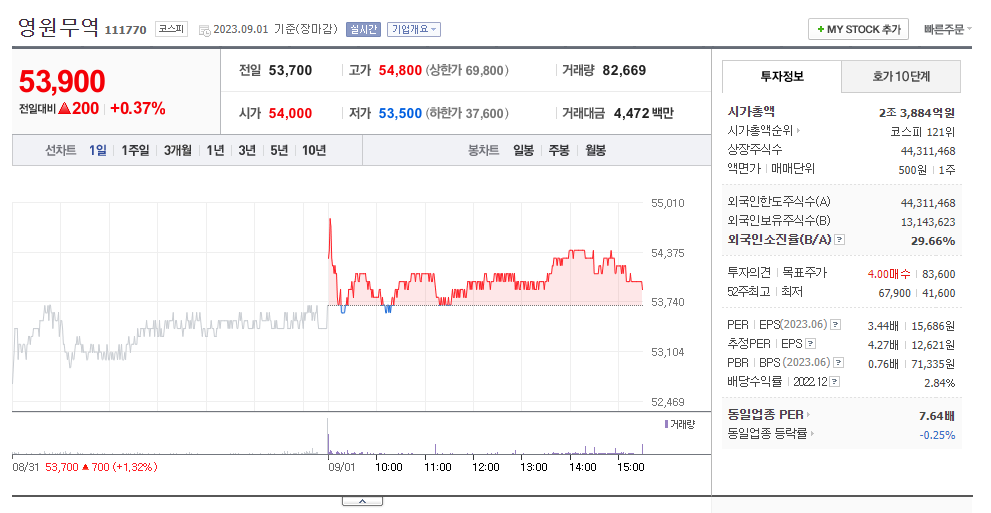 영원무역 현재 주가는 53,700원이며 전일 대비 -7.09원의 모습을 보이고 있습니다. 영원무역의 주주현황을 살펴보면 영원무역홀딩스(외 7인)이 지분 50.74%를 소유하고 있습니다. 영원무역는 섬유 및 의복 기업으로 장중 기준으로 주가는 53,700원 입니다. 삼성전자의 시가 총액은 2조3884억 원이며 발행 주식수는 29.66주 입니다. 외국인 보유 비중은 79,265% 이며 장중 거래량은 44,311,468를 기록했습니다. 매출액은 18,483억 원, 영업이익은 8,230억 원을 달성했습니다. EPS는 12,621원이며 영원무역 주식 배당수익률은 0.91% 입니다.
