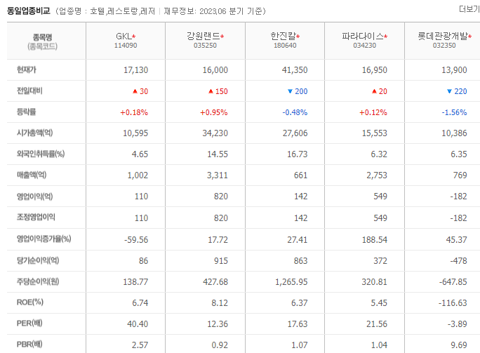 GKL 현재 주가는 17,100원이며 전일 대비 -590원의 모습을 보이고 있습니다. GKL의 주주현황을 살펴보면 이 지분 51.00%를 소유하고 있습니다. GKL는 호텔 및 레저 기업으로 장중 기준으로 주가는 17,100원 입니다. 삼성전자의 시가 총액은 1조596억 원이며 발행 주식수는 4.65주 입니다. 외국인 보유 비중은 639,230% 이며 장중 거래량은 61,855,670를 기록했습니다. 매출액은 2,094억 원, 영업이익은 -139억 원을 달성했습니다. EPS는 1,169원이며 GKL 주식 배당수익률은 10,577% 입니다.
