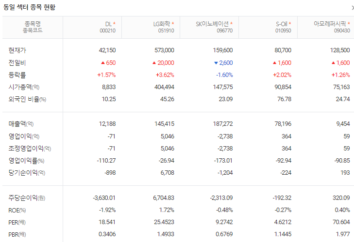 DL 현재 주가는 41,500원이며 전일 대비 -11.48원의 모습을 보이고 있습니다. DL의 주주현황을 살펴보면 대림(외 6인)이 지분 45.98%를 소유하고 있습니다. DL는 화학 기업으로 장중 기준으로 주가는 41,500원 입니다. 삼성전자의 시가 총액은 8833억 원이며 발행 주식수는 10.51주 입니다. 외국인 보유 비중은 207,019% 이며 장중 거래량은 20,955,884를 기록했습니다. 매출액은 25,062억 원, 영업이익은 2,875억 원을 달성했습니다. EPS는 -2,252원이며 DL 주식 배당수익률은 1.69% 입니다.