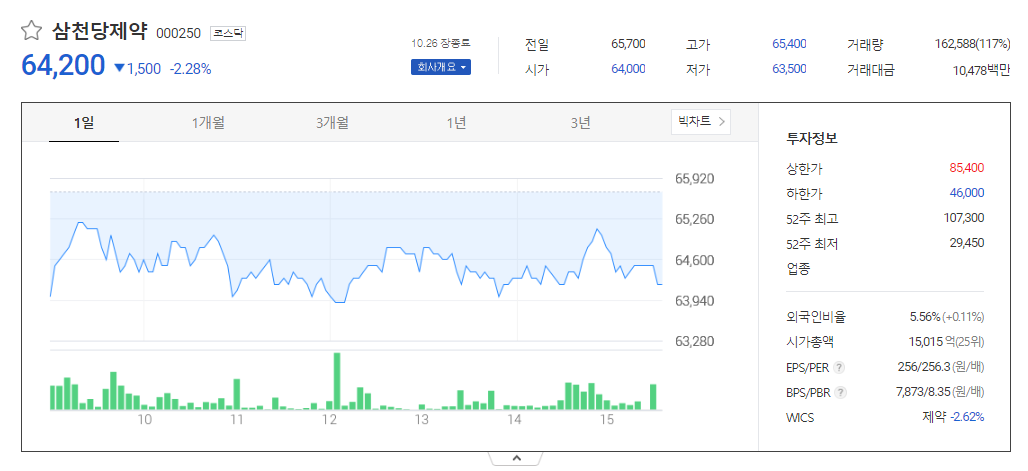삼천당제약 현재 주가는 65,700원이며 전일 대비 -1,200원의 모습을 보이고 있습니다. 삼천당제약의 주주현황을 살펴보면 소화(외 1인)이 지분 37.72%를 소유하고 있습니다. 삼천당제약는 제약 기업으로 장중 기준으로 주가는 65,700원 입니다. 천당제약 시가 총액은 1조5156억 원이며 발행 주식수는 5.56주 입니다. 외국인 보유 비중은 138,402% 이며 장중 거래량은 23,388,529를 기록했습니다. 매출액은 917억 원, 영업이익은 122억 원을 달성했습니다. 삼천당제약 주식 배당수익률은 15,366% 입니다.