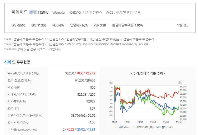 위메이드 현재 주가는 38,250원이며 전일 대비 -26.02원의 모습을 보이고 있습니다. 위메이드의 주주현황을 살펴보면 박관호(외 1인)이 지분 42.43%를 소유하고 있습니다. 위메이드는 게임 소프트웨어 기업으로 장중 기준으로 주가는 38,250원 입니다. 위메이드 시가 총액은 1조2572억 원이며 발행 주식수는 4.00주 입니다. 외국인 보유 비중은 522,681% 이며 장중 거래량은 33,796,962를 기록했습니다. 매출액은 2,532억 원, 영업이익은 -849억 원을 달성했습니다. EPS는 -1,331원이며 위메이드 주식 배당수익률은 2.38% 입니다.