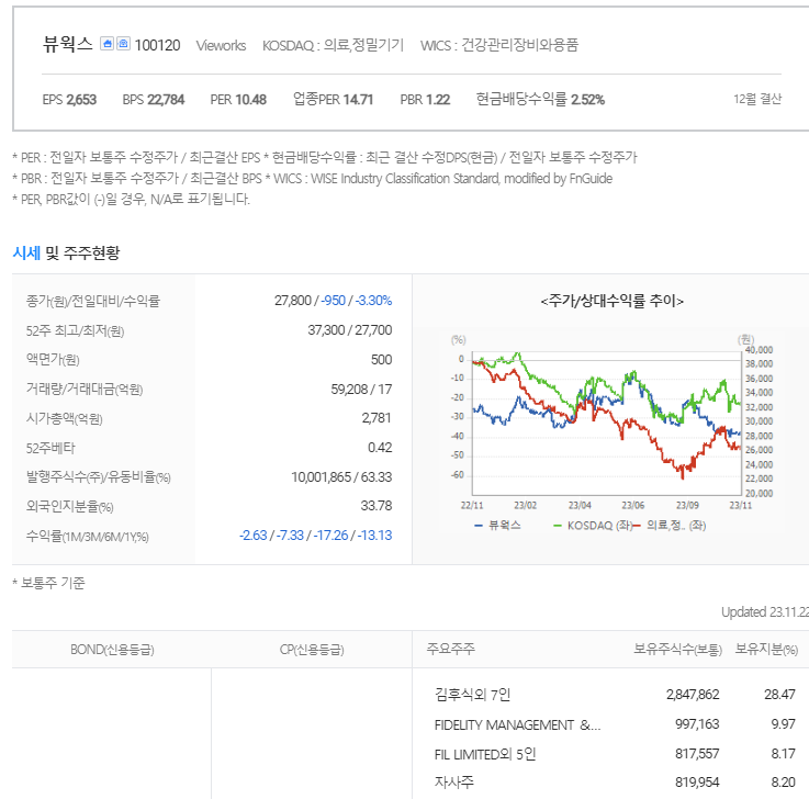뷰웍스 현재 주가는 27,800원이며 전일 대비 -950원의 모습을 보이고 있습니다. 뷰웍스의 주주현황을 살펴보면 김후식(외 7인)이 지분 28.47%를 소유하고 있습니다. 뷰웍스는 의료 장비 및 서비스 기업으로 장중 기준으로 주가는 27,800원 입니다. 뷰웍스 시가 총액은 2696억 원이며 발행 주식수는 33.78주 입니다. 외국인 보유 비중은 59,208% 이며 장중 거래량은 10,001,865를 기록했습니다. 매출액은 1,061억 원, 영업이익은 437억 원을 달성했습니다. EPS는 1,445원이며 뷰웍스 주식 배당수익률은 0.96% 입니다.