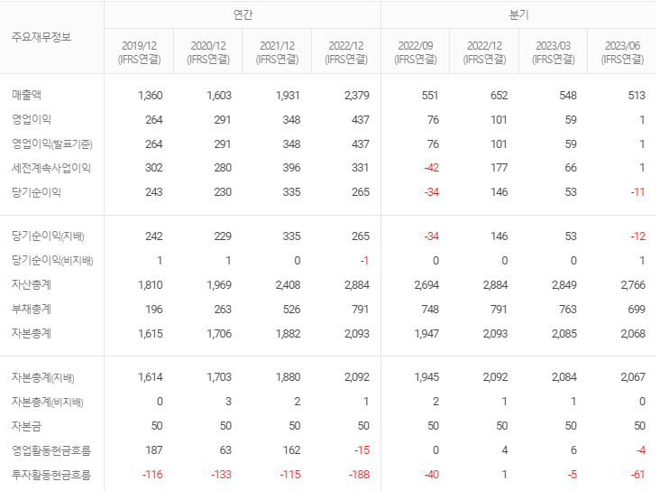 -2023년 6월 전년동기 대비 연결기준 매출액은 9.8% 감소, 영업이익은 76.8% 감소, 당기순이익은 73.3% 감소. COVID-19로 성장이 둔화되었던 치과용 동영상 디텍터는 중국 등 일부 시장을 중심으로 지난해부터 높은 성장율을 보이고 있음. 정지영상과 산업용 엑스레이 디텍터, 산업용 카메라는 금리 인상, 글로벌 경기 둔화와 고객사 투자 수요 위축에 따라 전년 동기 대비 매출이 하락하였음.
