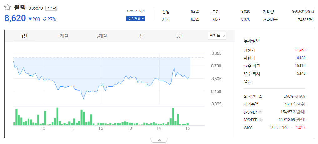 원텍 현재 주가는 8,820원이며 전일 대비 -1.34원의 모습을 보이고 있습니다. 원텍의 주주현황을 살펴보면 김종원(외 18인)이 지분 52.57%를 소유하고 있습니다. 원텍는 의료 장비 및 서비스 기업으로 장중 기준으로 주가는 8,820원 입니다. 시가 총액은 7548억 원이며 발행 주식수는 5.98주 입니다. 외국인 보유 비중은 1,107,773% 이며 장중 거래량은 88,173,915를 기록했습니다. 매출액은 854억 원, 영업이익은 268억 원을 달성했습니다. EPS는 587원이며 원텍 주식 배당수익률은 0.96% 입니다.