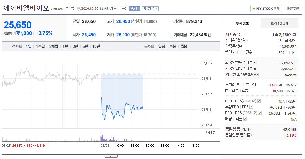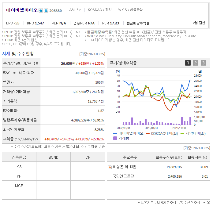 에이비엘바이오 현재 주가는 26,650원이며 전일 대비 원의 모습을 보이고 있습니다. 에이비엘바이오의 주주현황을 살펴보면 이상훈 주주가 전체 지분 31.09%를 소유하고 있습니다. 에이비엘바이오는 바이오 기업으로 장중 기준으로 주가는 26,650원 입니다. 에이비엘바이오의 시가 총액은 1조2213억 원이며 발행 주식수는 47,892,539주 입니다. 외국인 보유 비중은 8.28% 이며 장중 거래량은 1,007,660원 을 기록했습니다. 매출액은 655억 원을 달성했습니다. EPS는 -569원이며 에이비엘바이오 주식 배당수익률은 12,763% 입니다.