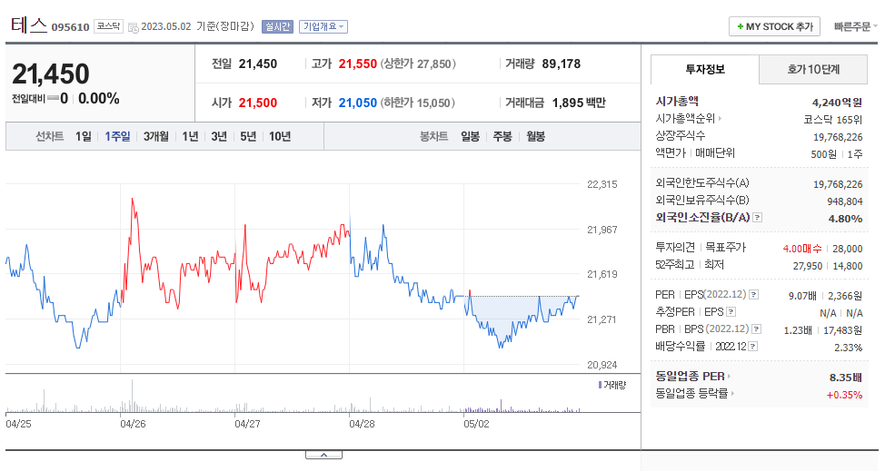 이 글에서는 테스 주가 전망과 목표 주가, 기업 정보에 대해서 설명합니다. 주식 투자 전에 기업 현황고 현재 시장 흐름에 대해서 정리해보는 것은 아주 중요합니다. 테스 주식의 주요 현황과 투자 정보를 확인하시고 현재 시장에서의 흐름을 파악해 보겠습니다.