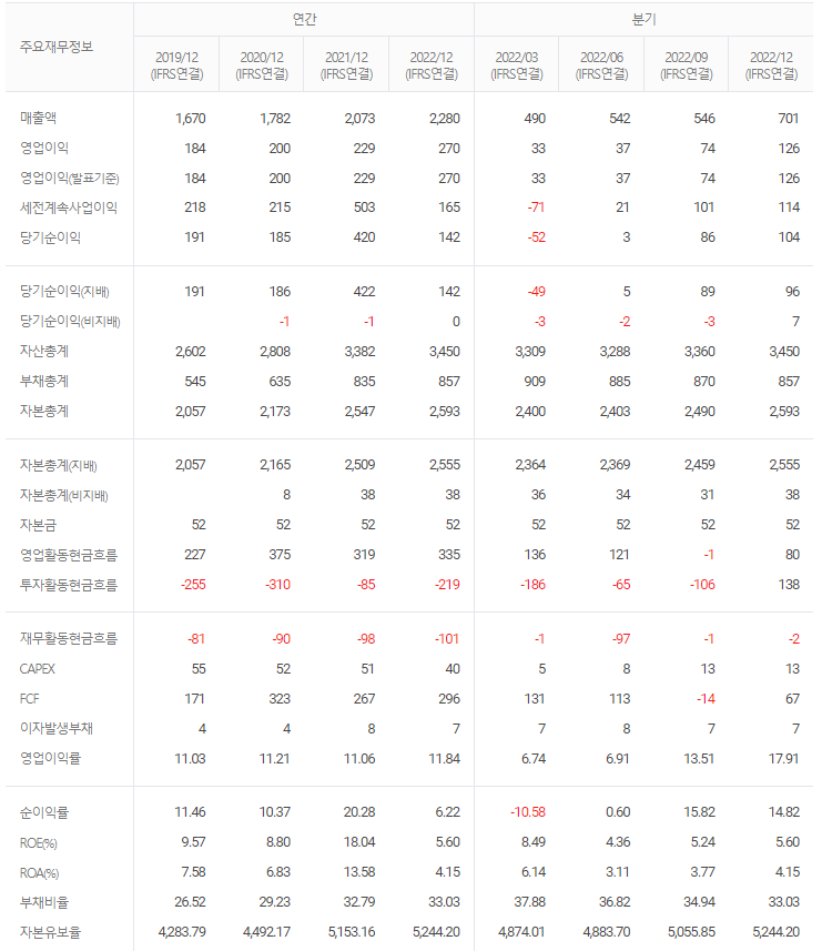 -2022년 9월 전년동기 대비 연결기준 매출액은 12.8% 증가, 영업이익은 4.2% 증가, 당기순이익은 86.7% 감소. 매출액과 영업이익은 증가했지만 영업외손익의 영향으로 당기순이익은 전년 동기 대비 크게 감소함. 동사는 2021년 타사 협력, 연구, 투자를 포함한 얼라이언스를 확대하고 관련 산업 전문성을 개선해 제품과 서비스 기반의 OT 보안 오퍼링을 구축할 계획임.