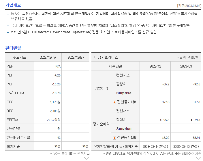 -동사는 희귀/난치성 질환에 대한 치료제를 연구개발하는 기업이며 합성의약품 및 바이오의약품 양 분야의 신약 창출시스템을 보유하고 있음. 국내 바이오신약으로는 최초로 미FDA 승인을 받은 혈우병 치료제 '앱스틸라'의 핵심 연구진이 바이오신약을 연구개발중. 2021년 5월 CDO(Contract Development Organization) 전문 회사인 프로티움사이언스를 신규 설립.