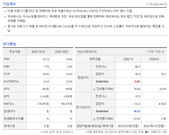 -2022년 12월 전년동기 대비 연결기준 매출액은 43.4% 증가, 영업이익은 44.2% 증가, 당기순이익은 99.6% 증가. HIFU 소모품 카트리지는 신제품 리니어Z 출시에 따라 매출액이 점진적으로 증가하였음. 리니어Z는 국내 마케팅을 통해 판매 확대에 주력할 예정이며, 기존 리니어펌은 중저가 모델로서 판매 확대될 것으로 예상되어 국내 점유율 성장이 기대됨.