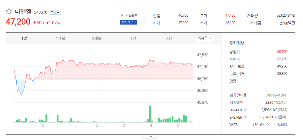 티앤엘 현재 주가는 46,700원이며 전일 대비 -1,300원의 모습을 보이고 있습니다. 티앤엘의 주주현황을 살펴보면 최윤소(외 8인)이 지분 44.57%를 소유하고 있습니다. 티앤엘는 의료 장비 및 서비스 기업으로 장중 기준으로 주가는 46,700원 입니다. 삼성전자의 시가 총액은 3836억 원이며 발행 주식수는 6.85주 입니다. 외국인 보유 비중은 62,599% 이며 장중 거래량은 8,128,000를 기록했습니다. 매출액은 816억 원, 영업이익은 223억 원을 달성했습니다. EPS는 3,646원이며 티앤엘 주식 배당수익률은 3,796% 입니다.